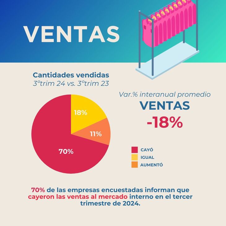 La encuesta consultó a más de 100 empresas de los distintos eslabones textiles e indumentaria sobre la evolución de las principales variables de ventas, producción, uso de capacidad instalada, inversiones y comercio exterior en el III trimestre de 2024. Este rubro genera 540 mil puestos de trabajo y, por ende, da sustento a 2 millones de personas a nivel federal.