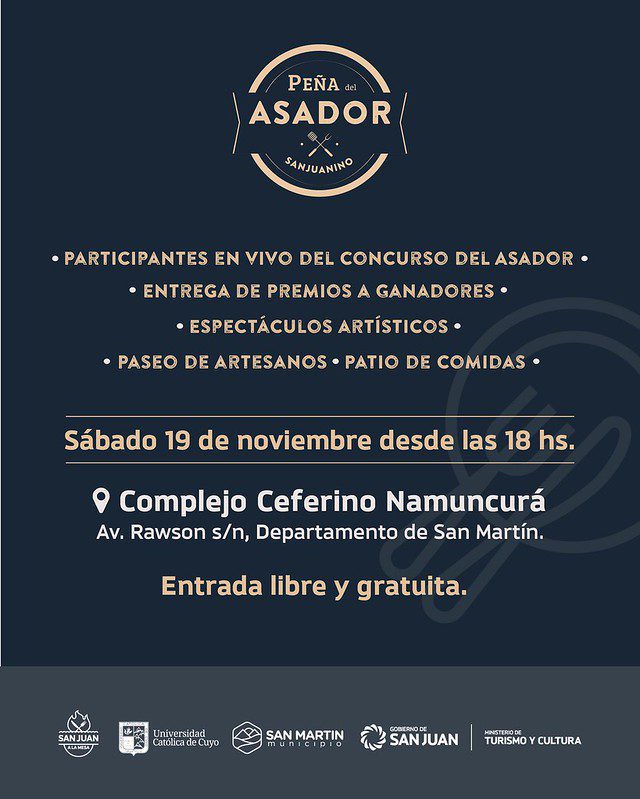 Este 19 de noviembre, el Complejo Ceferino Namuncurá celebrará la quinta edición del Concurso y Peña del Asador Sanjuanino. Además de saborear platos exquisitos realizados por expertos, los visitantes podrán disfrutar de shows locales y nacionales.