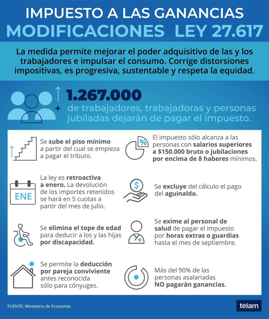De esta manera entran en vigencia los modificaciones dispuestas mediante la ley 27.617, sancionada en el Congreso el pasado 8 de abril, por lo que quienes ganen hasta $124.500 netos -una vez descontados aportes a la seguridad social- dejarán de pagar este impuesto con retroactividad a enero, monto a partir del cual se conformará una nueva escala de deducciones.