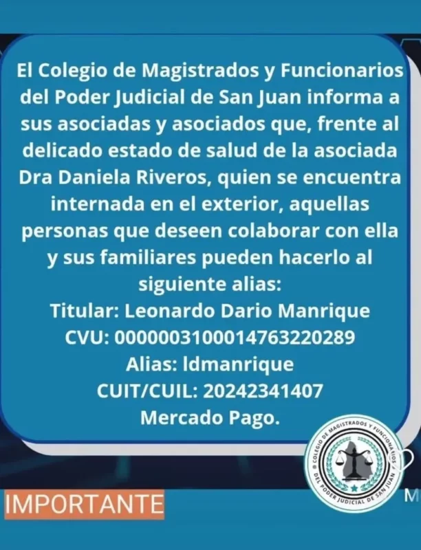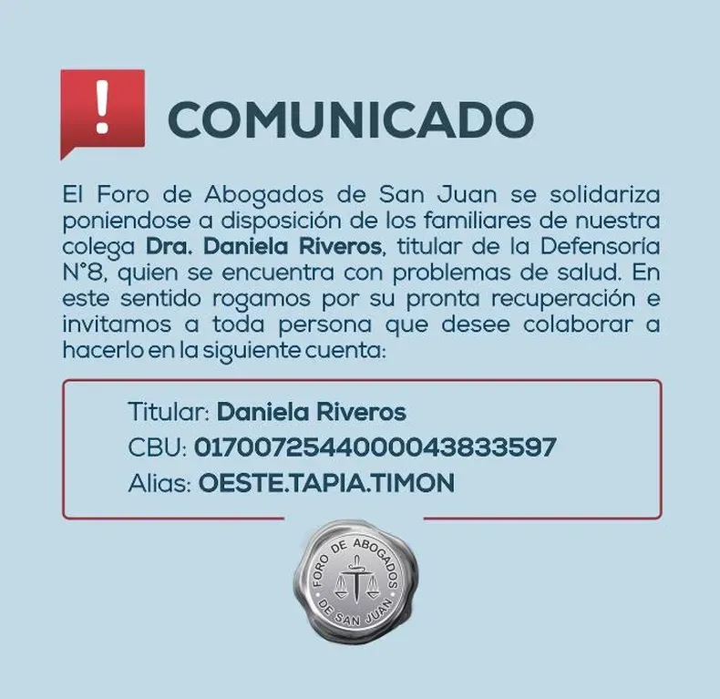 En ese contexto, tanto desde el Foro de Abogados de San Juan como desde el Colegio de Magistrados, compartieron posteos a través de las redes sociales pidiendo la colaboración de todos los que puedan ayudar: