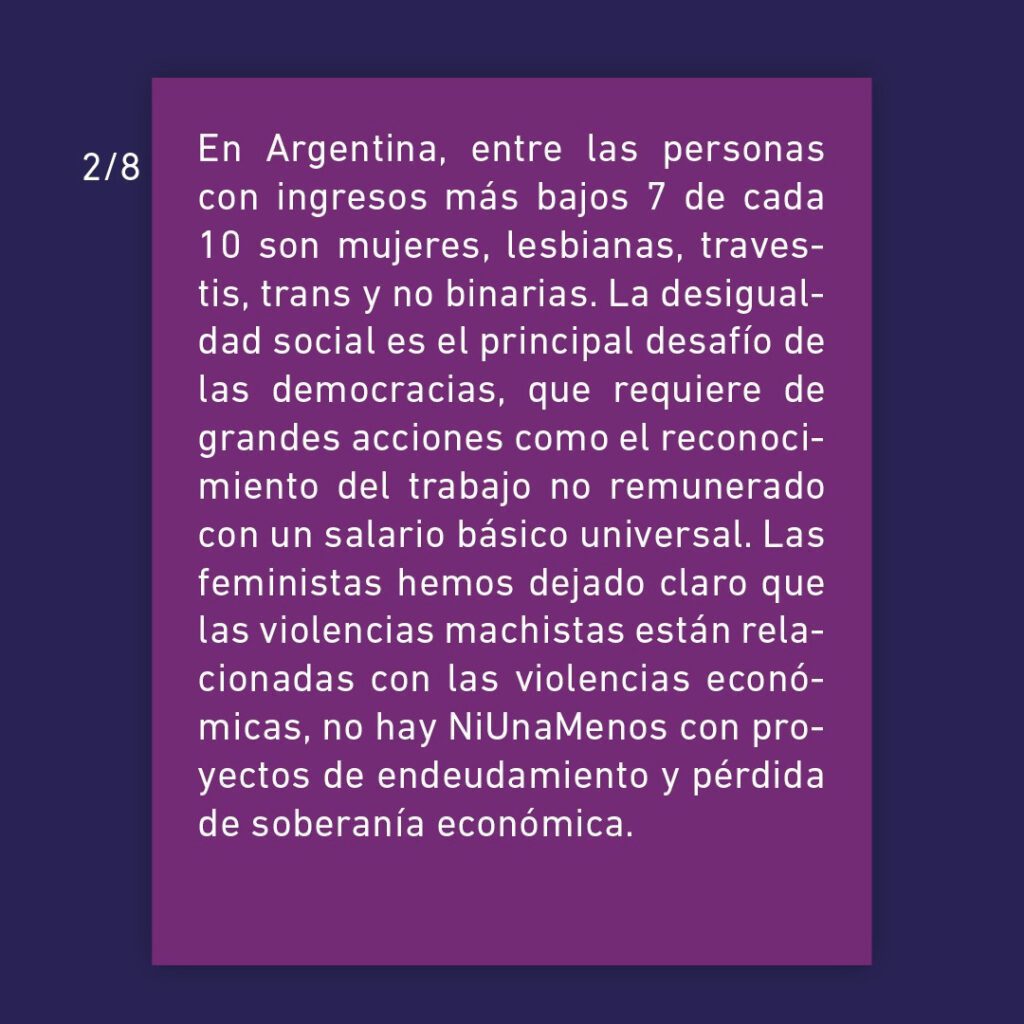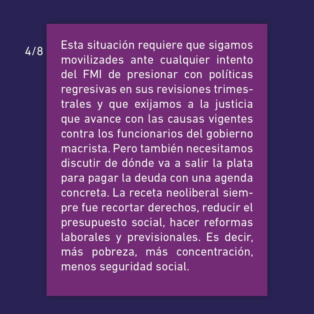«Con el Feminismo Popular exigimos que se apruebe el proyecto: Fondo Nacional para la Cancelación de la Deuda con el Fondo Monetario Internacional; presentado por el bloque del Frente de Todos en el Senado, que propone que quienes fugaron los bienes al exterior realicen un aporte especial de emergencia, de al menos el 20% del valor de los bienes que están en una situación de evasión impositiva», exigen los adherentes en el Manifiesto.