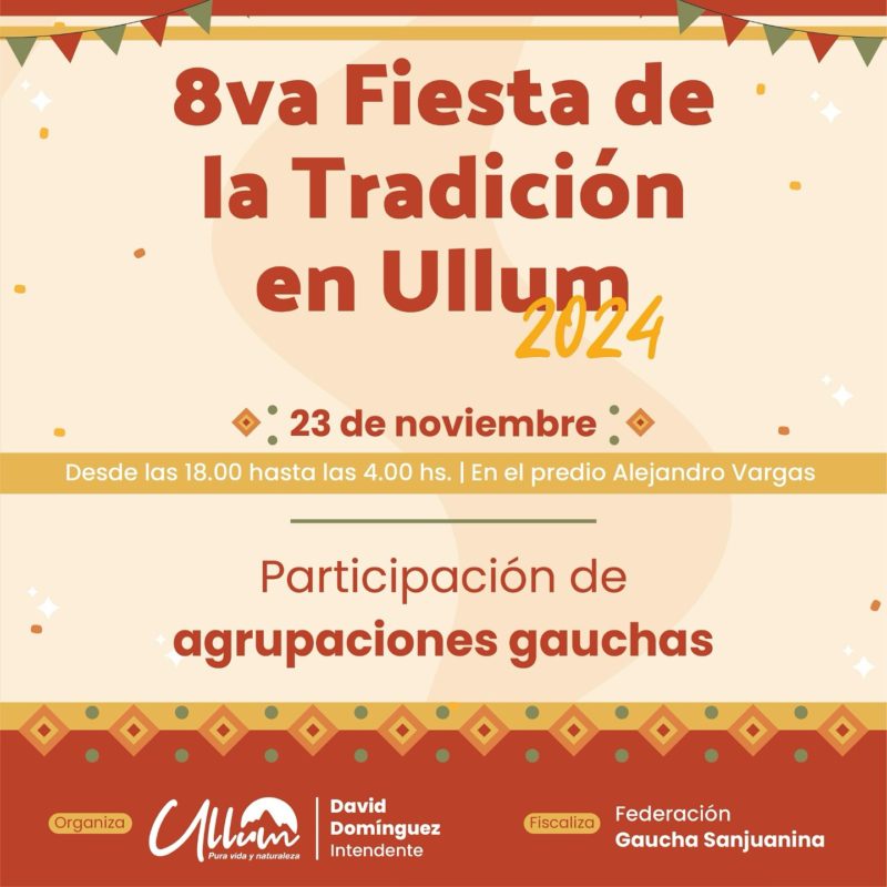 Este 23 de noviembre en Ullum se desarrollará la 8° edición de la Fiesta de la Tradición, organizada por el municipio, con fiscalización de la Federación Gaucha Sanjuanina y a beneficio de la parroquia. Las entradas tienen un precio muy accesible, a $3000.