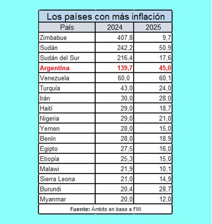 La proyección de inflación del FMI para el año en curso se ubica por encima de las últimas proyecciones privadas, contenidas en el Relevamiento de Expectativas de Mercado, que la sitúan en 123,6%. La estimación del Fondo también excede – y por mucho – la inflación esperada por el Gobierno según el proyecto de presupuesto 2025. Contra 45% que augura el FMI, el Poder Ejecutivo proyecta un aumento de precios de 18,3%.