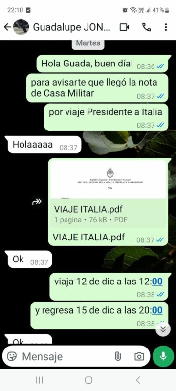 “Informo a usted que, el día 12 de diciembre de 2024 a las 12:00 horas aproximadamente, el señor Presidente de la Nación, viajará a la ciudad de Roma (República Italiana), teniendo previsto su regreso el día 15 de diciembre de 2024 a las 20:00 horas aproximadamente”, reza la misiva firmada por el jefe de Casa Militar, Sebastián Ibáñez,