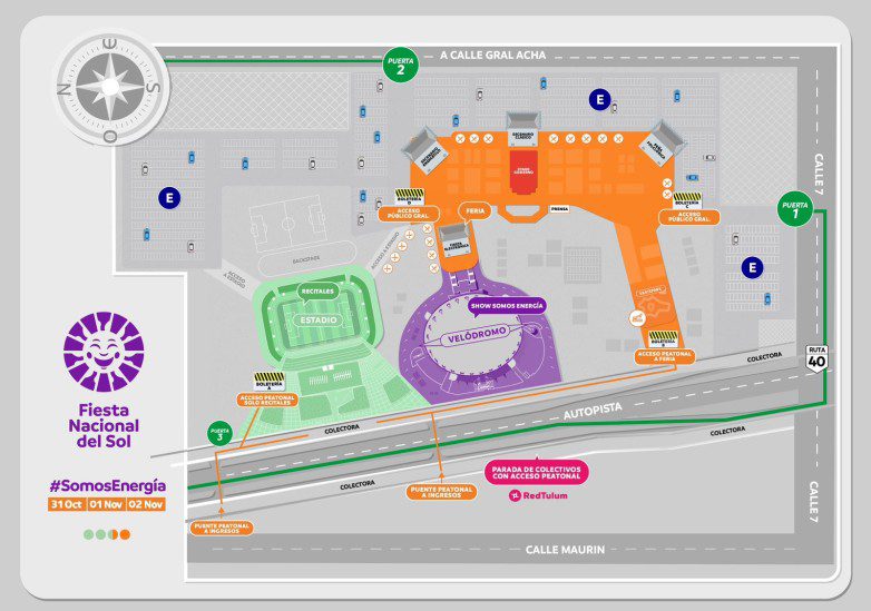 • La puerta 3, 4, 5 y 6 están ubicadas sobre Ruta 40, a metros se ubica la boletería A y se puede ingresar de manera directa al Estadio para disfrutar los recitales, donde estarán los artistas nacionales. La boletería B vincula de manera directa con el acceso peatonal a la feria.