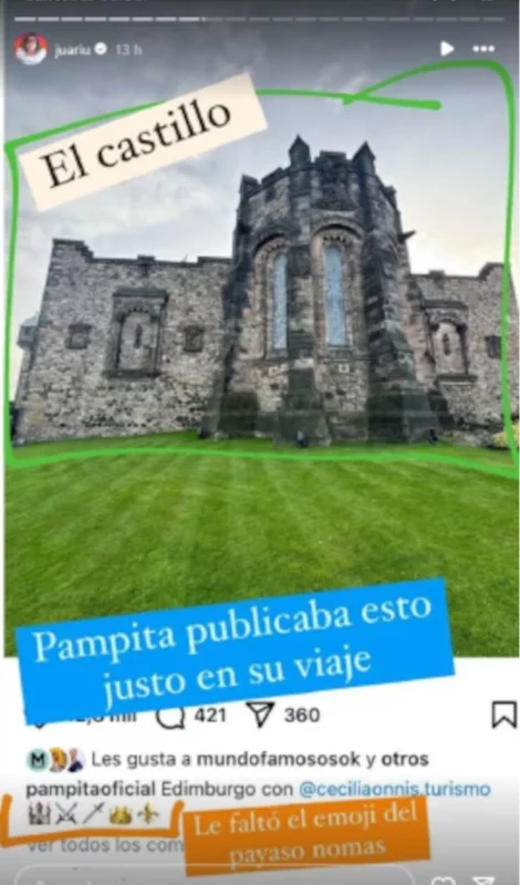 La mujer de Cambiaso subió un mensaje enigmático: “Si un payaso se muda a un castillo, no se vuelve rey; el castillo se convierte en circo”. Hasta ahí todo parecía normal, pero la influencer observó que Pampita compartió una foto de un castillo durante su viaje a la ciudad escocesa de Edimburgo, lo que sería tomado como una indirecta.