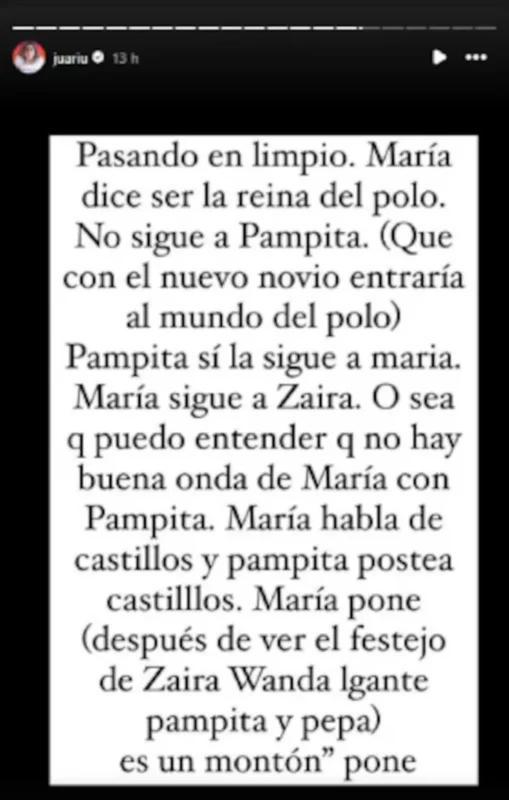 Luego, la influencer sacó sus propias conclusiones: “María dice ser la reina del polo. No sigue a Pampita, que con el nuevo novio entraría al mundo del polo. Pampita sí sigue a María. María sigue a Zaira. O sea, que puedo entender que no hay buena onda de María con Pampita. María habla de castillos y Pampita postea castillos. María pone después del festejo de Zaira, Wanda, L-Gante, Pampita y Pepa, ‘es un montón’”.