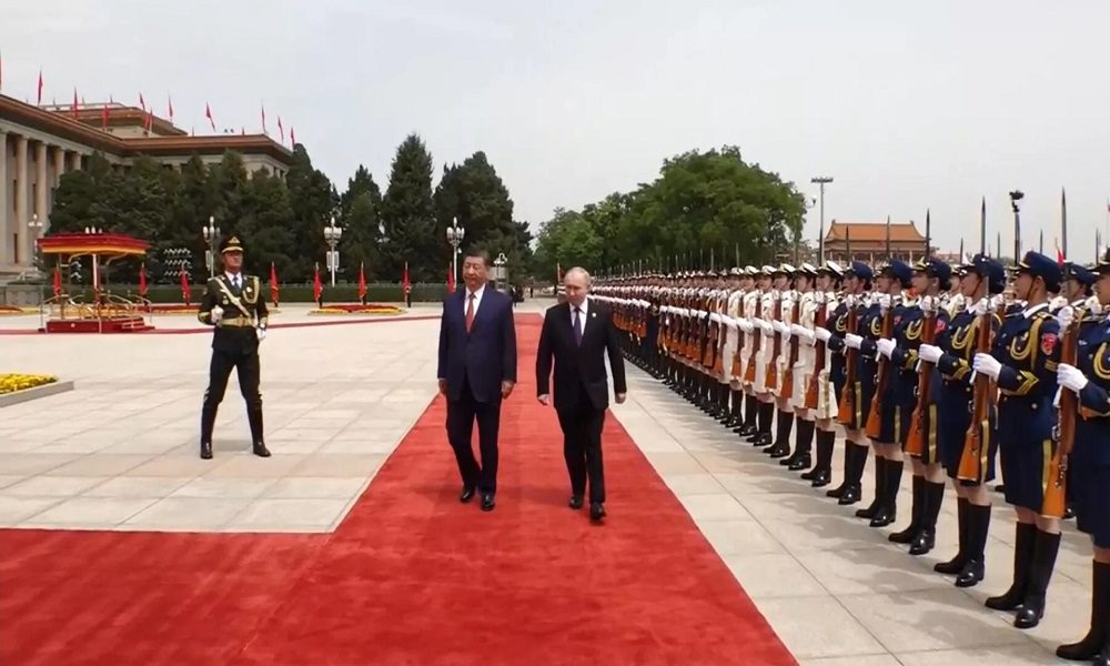 El mandatario de la Federación de Rusia fue recibido con honores y con una ceremonia de bienvenida de parte del Ejército Popular de Liberación de China. Los himnos de ambas naciones sonaron mientras Xi y Putin se estrechaban la mano afuera del recinto histórico.