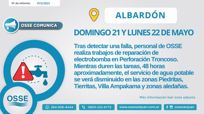 Por tal motivo y mientras duren las tareas de reemplazo, 48 horas aproximadamente, el servicio de agua potable se verá disminuido en las zonas Piedritas, Tierritas, Villa Ampakama y zonas aledañas.