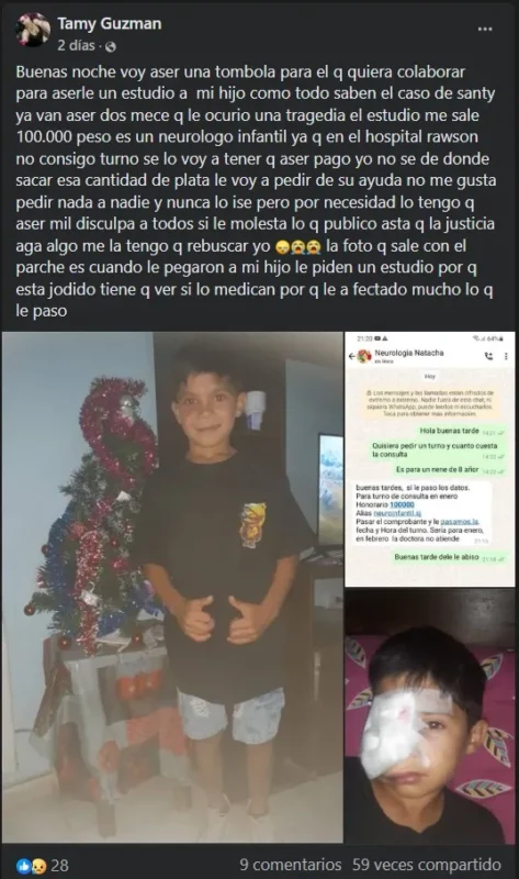 Su madre, Tamara Guzmán, recurrió a las redes sociales para pedir ayuda a la comunidad sanjuanina. «No sé de dónde sacar esa cantidad de plata, le voy a pedir su ayuda. No me gusta pedir nada a nadie y nunca lo hice, pero por necesidad lo tengo que hacer», expresó la mujer en un conmovedor mensaje en Facebook.