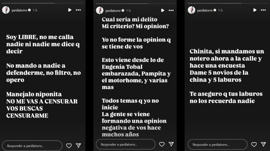 «Soy libre, no me calla nadie ni nadie me dice que decir. No mando a nadie a defenderme, no filtro, no opero. Manéjalo niponita. No me vas a censurar. Vos buscás censurarme«, escribió indignada la angelita en su cuenta oficial de Instagram y agregó: «¿Cuál sería mi delito? ¿Mi criterio? ¿Mi opinión? Yo no forme la opinión que se tiene de vos. Esto viene desde lo de Eugenia Tobal embarazada, Pampita y el motorhome, y varias más«.
